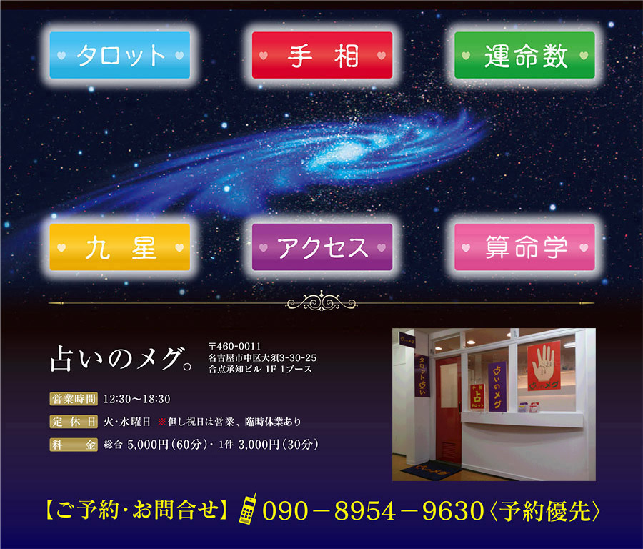 ◇占いのメグ◇愛知県名古屋市中区大須3-30-25合点承知ビル1F